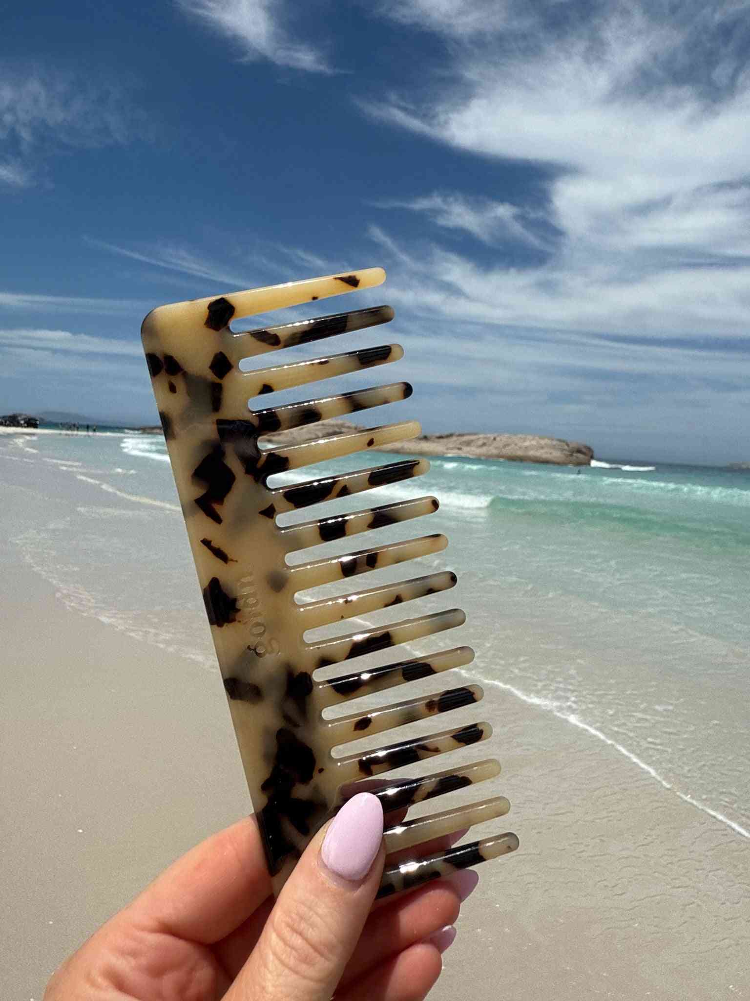 Laser-engraved with our signature goldn branding, this classic comb comes in fresh new colours. Tortoiseshell and Cream feature a glossy shine, while Cognac, Lilac, and Botanical offer a chic matte grain effect.